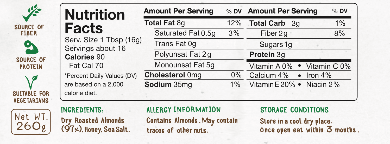 Dry Roasted Almonds (97%), Honey, Sea Salt.