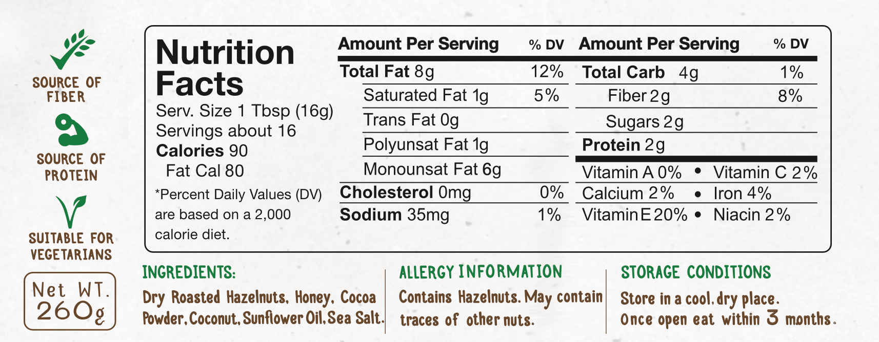 Contains Hazelnuts, may contain traces of other nuts. This product is made in a factory that handles peanuts and almonds.